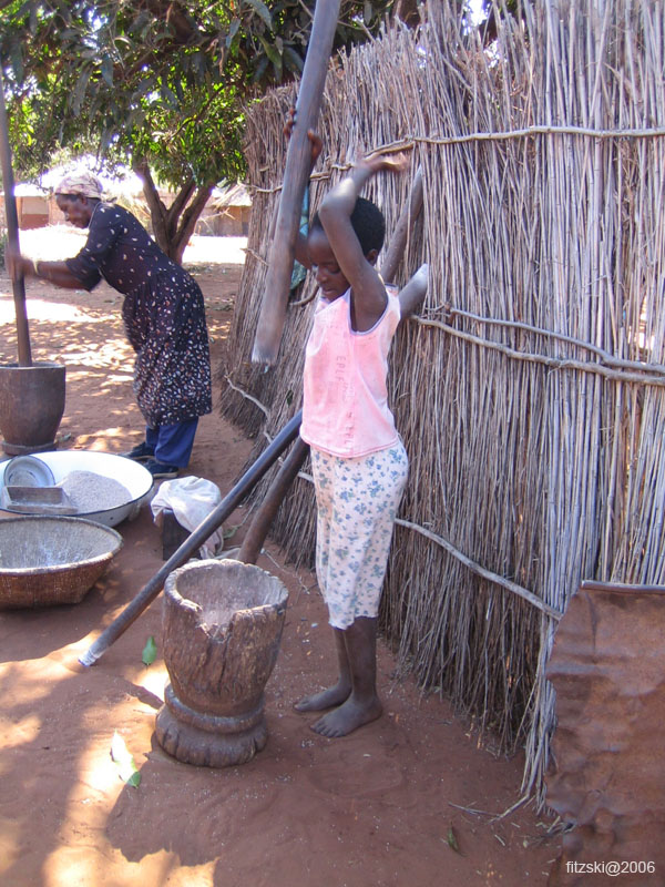 July 1, 2006 - A young girl is already well-practiced at beating the sorghum - Mukuni Village (Livingstone), Zambia